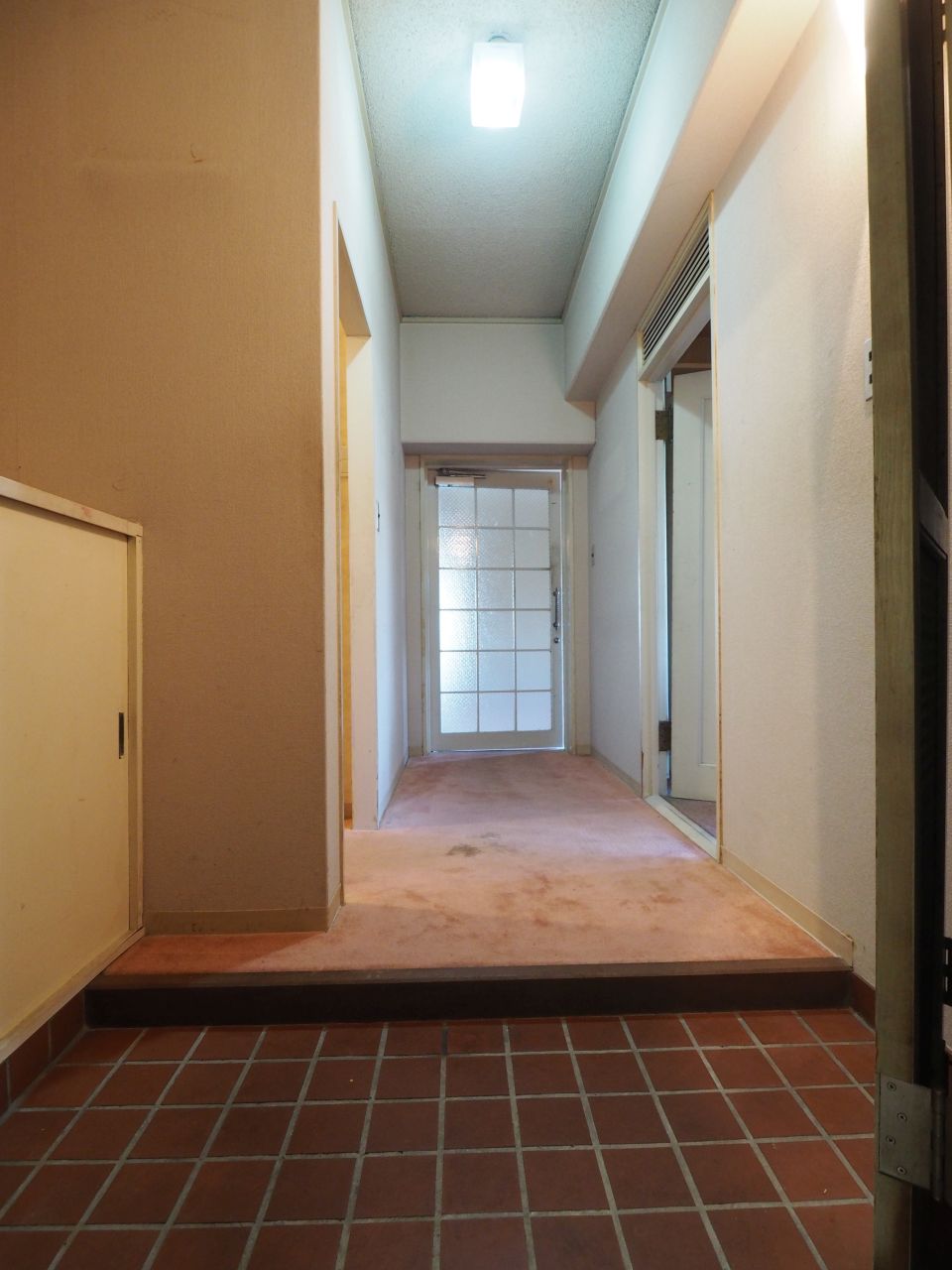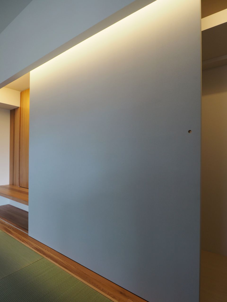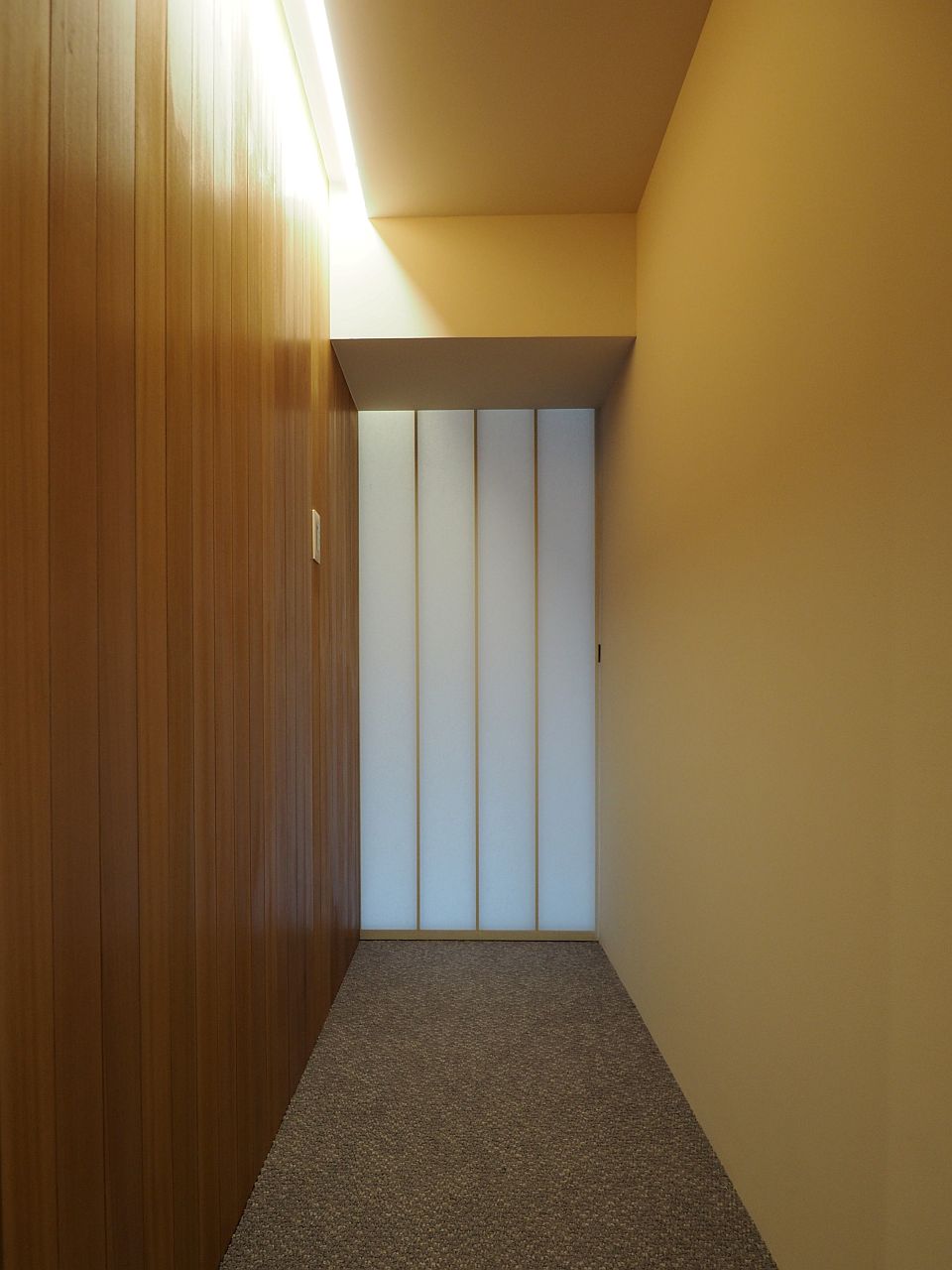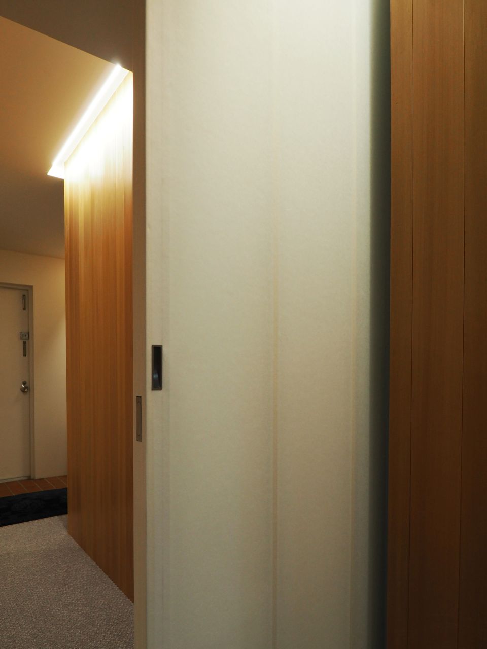 玄関からリビングへと続くドアと和室の建具は、和紙に特殊な加工を施した「ワーロン」を貼って作ったオリジナル。和の趣ある風合いを持ちつつ、やわらかく光を通す素材です。