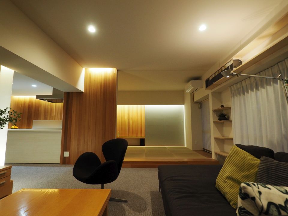 また、洋室と和室を撤去してリビングダイニングを約27帖に広げつつ、間にTVボードにもなる壁を造作して空間をさりげなく分けています。