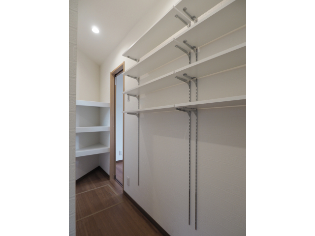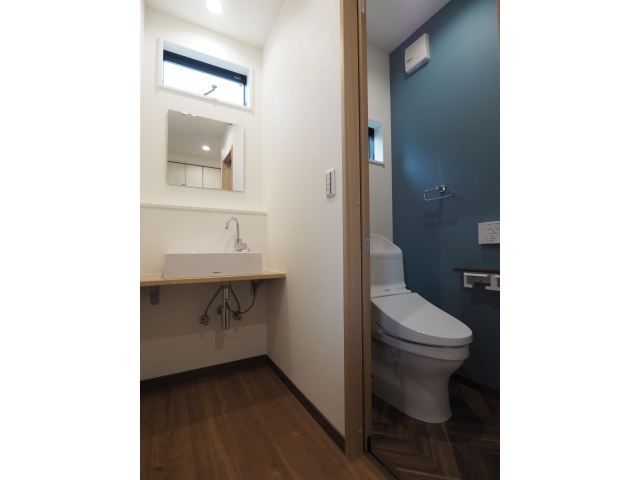 キッチン奥のパントリーはそのまま土間収納から勝手口へとつながり、敷地を無駄にしない動線。また、洗面室とバスルームはあえて2階のインナーバルコニーに向かってレイアウトし、開放感を高めています。