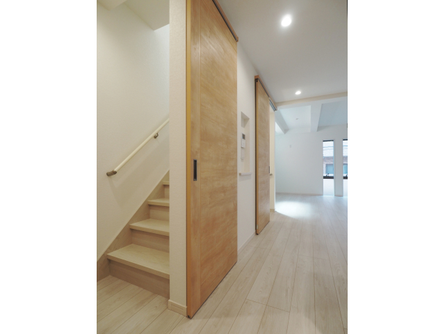 神戸市東灘区での分譲実績です。 ペースのプランに、お客様のご要望を加えながら設計させて頂きました。 約20坪という限られた敷地面積を、どう使いたいか。…というテーマに対し「リビングの広さは譲れない」ということで、2階全体を21帖超のLDKにしました。 また、玄関には大容量のシューズインクローク、廊下にも家族共有の収納を設けるなど、収納の多さにもこだわっています。 フローリングも建具も明るい色味にし、やわらかい光が満ちる空間に。