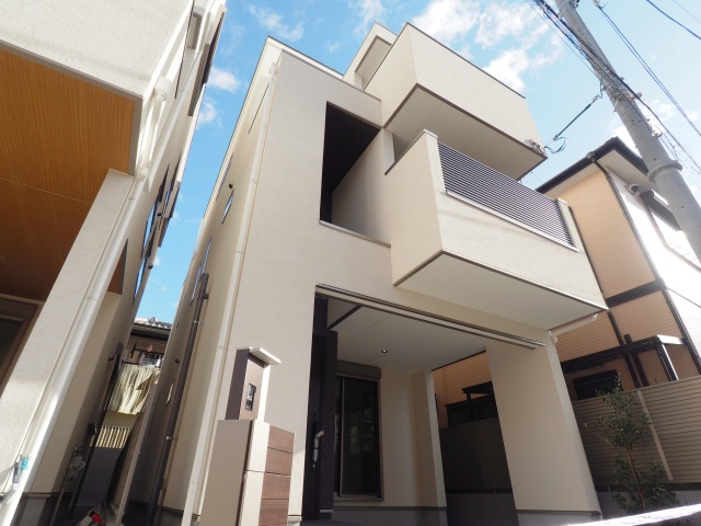外観は、ハコを重ねたようなシンプルな3層のキュービックスタイル。白の外壁に、玄関周りのタイルや木目の軒天で変化をつけています。