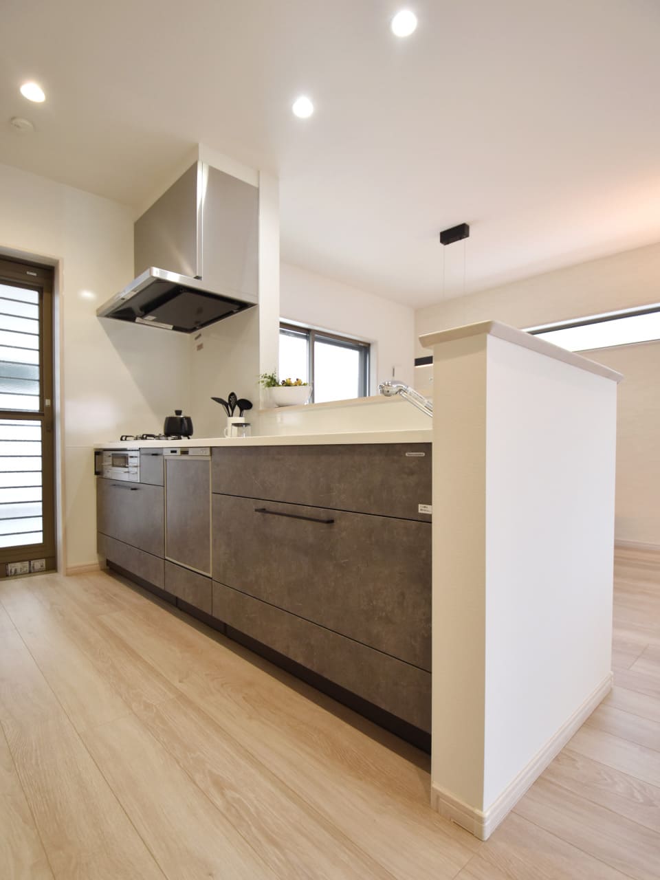 また、ゆったりとしたアプローチの奥に佇む南側区画は、リビングに入ると驚くほど開放的な吹き抜け空間が広がります。対面キッチンの奥には勝手口、ストック収納、カウンターデスクを配置し、家事をする人目線の「暮らしやすさ」にとことんこだわった設計。