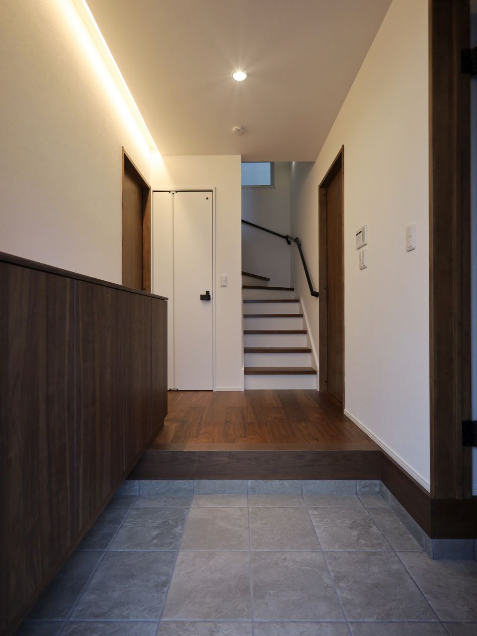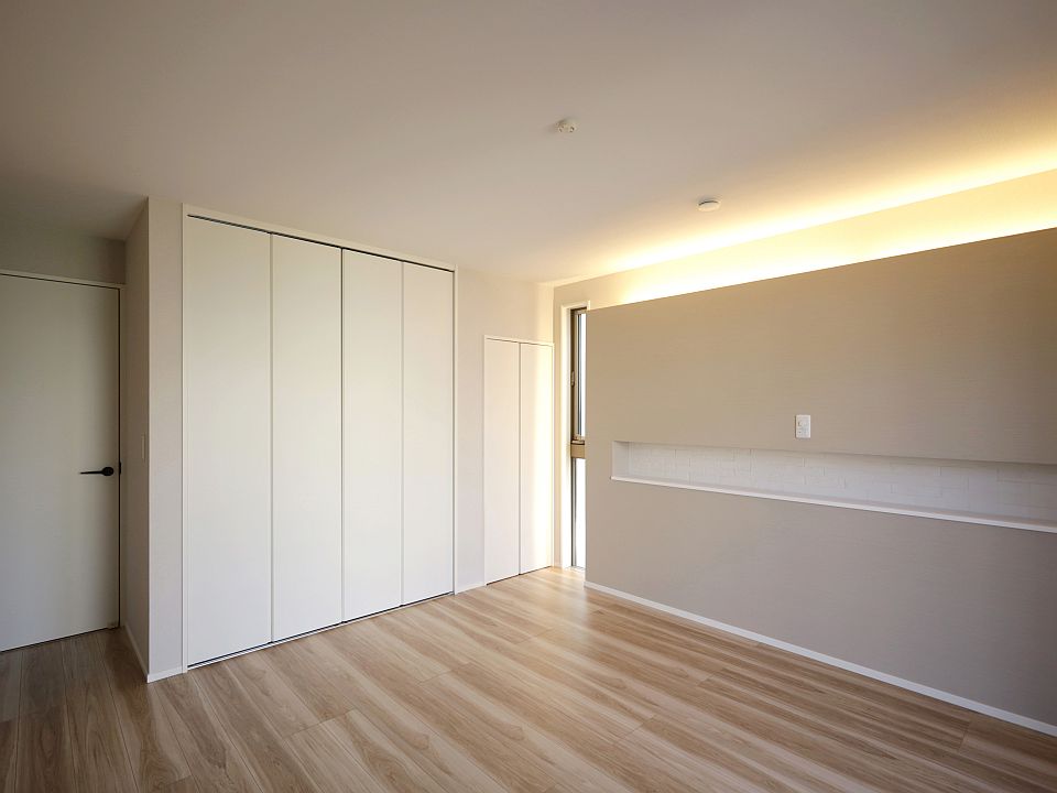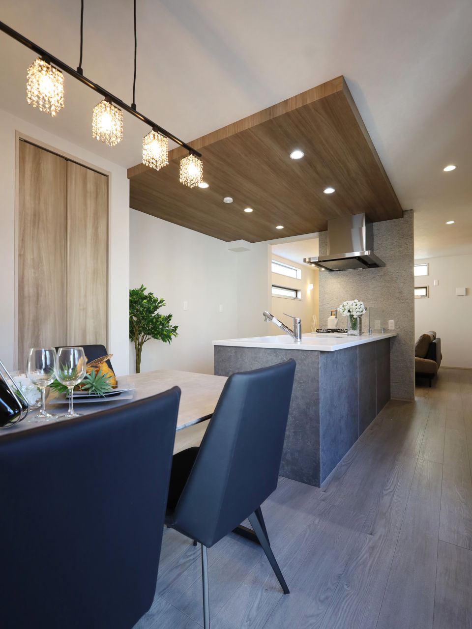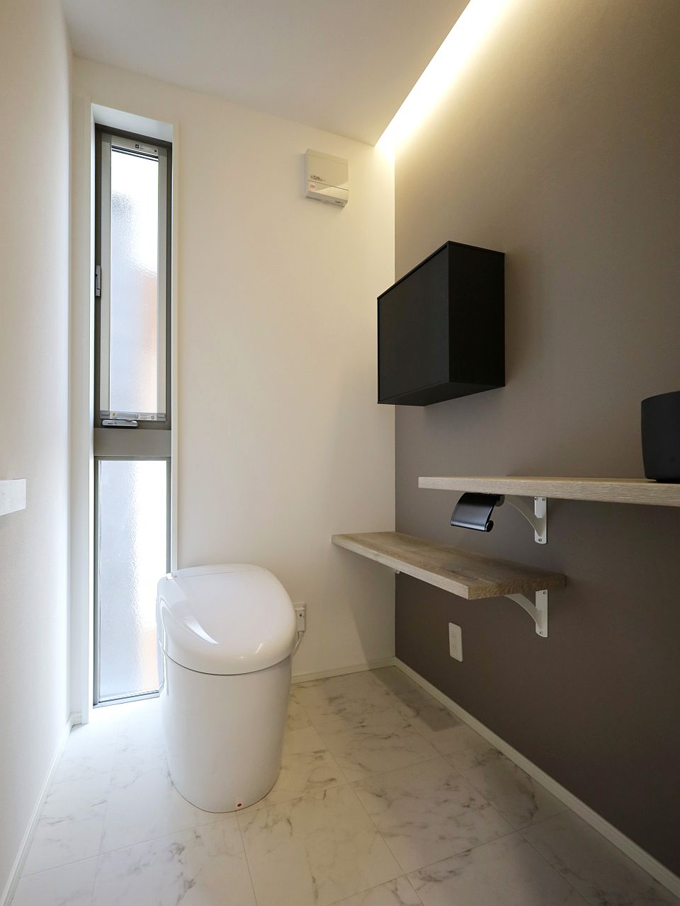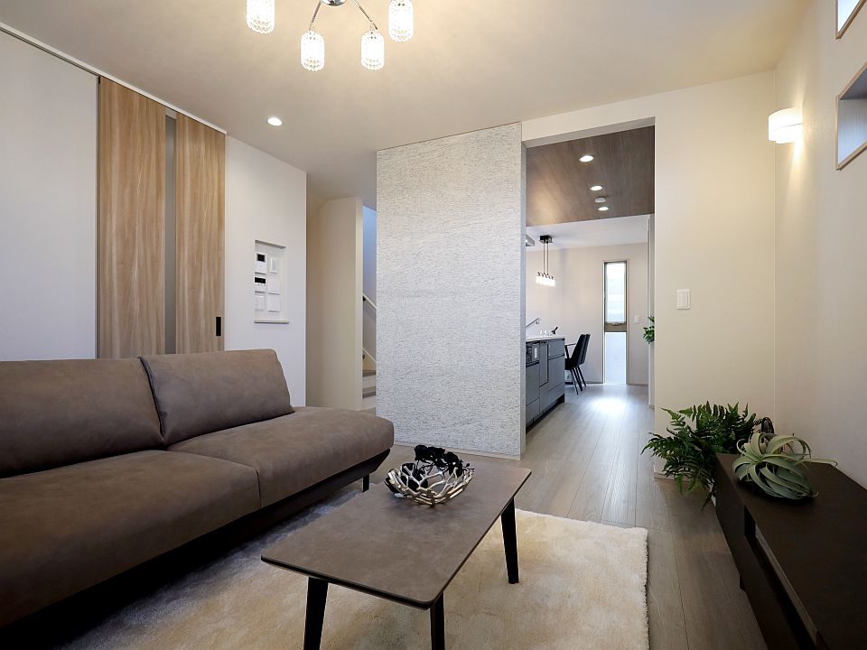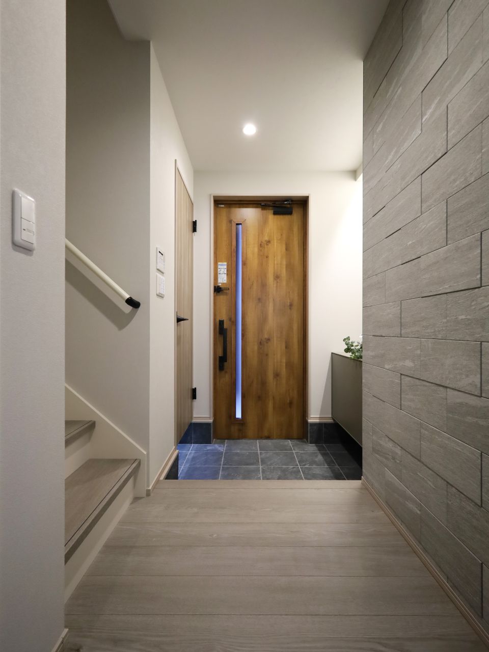 またエクステリア・インテリアともに「真っ白で明るい空間」というよりは落ち着きのある素材や色を選び、光と影のコントラストが美しく出るようなデザインに。間接照明で、エコカラットの凹凸やアクセントクロスが美しく浮かび上がる工夫も施しています。