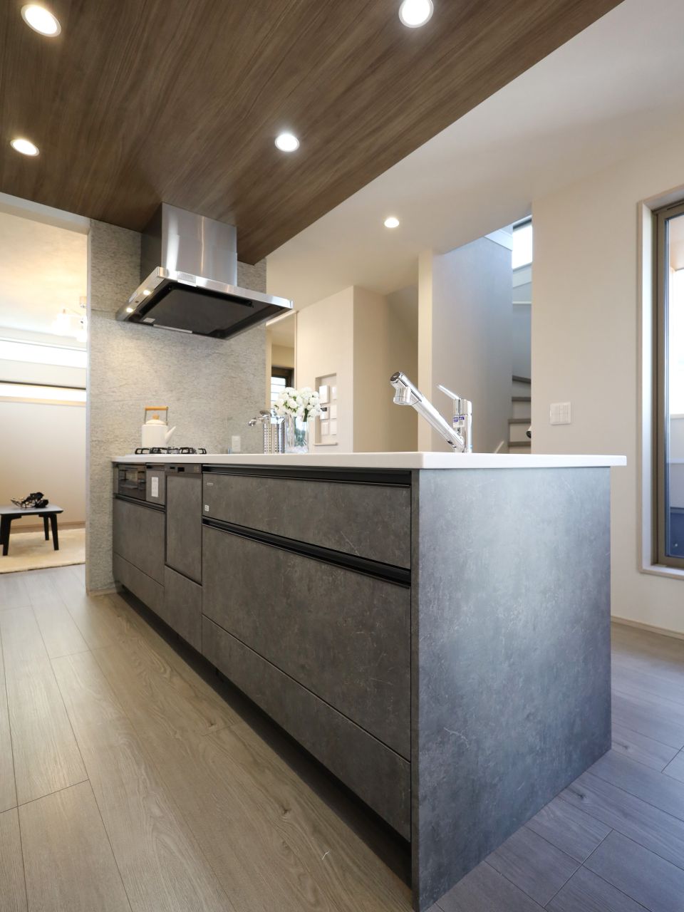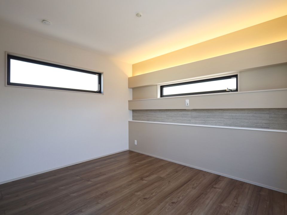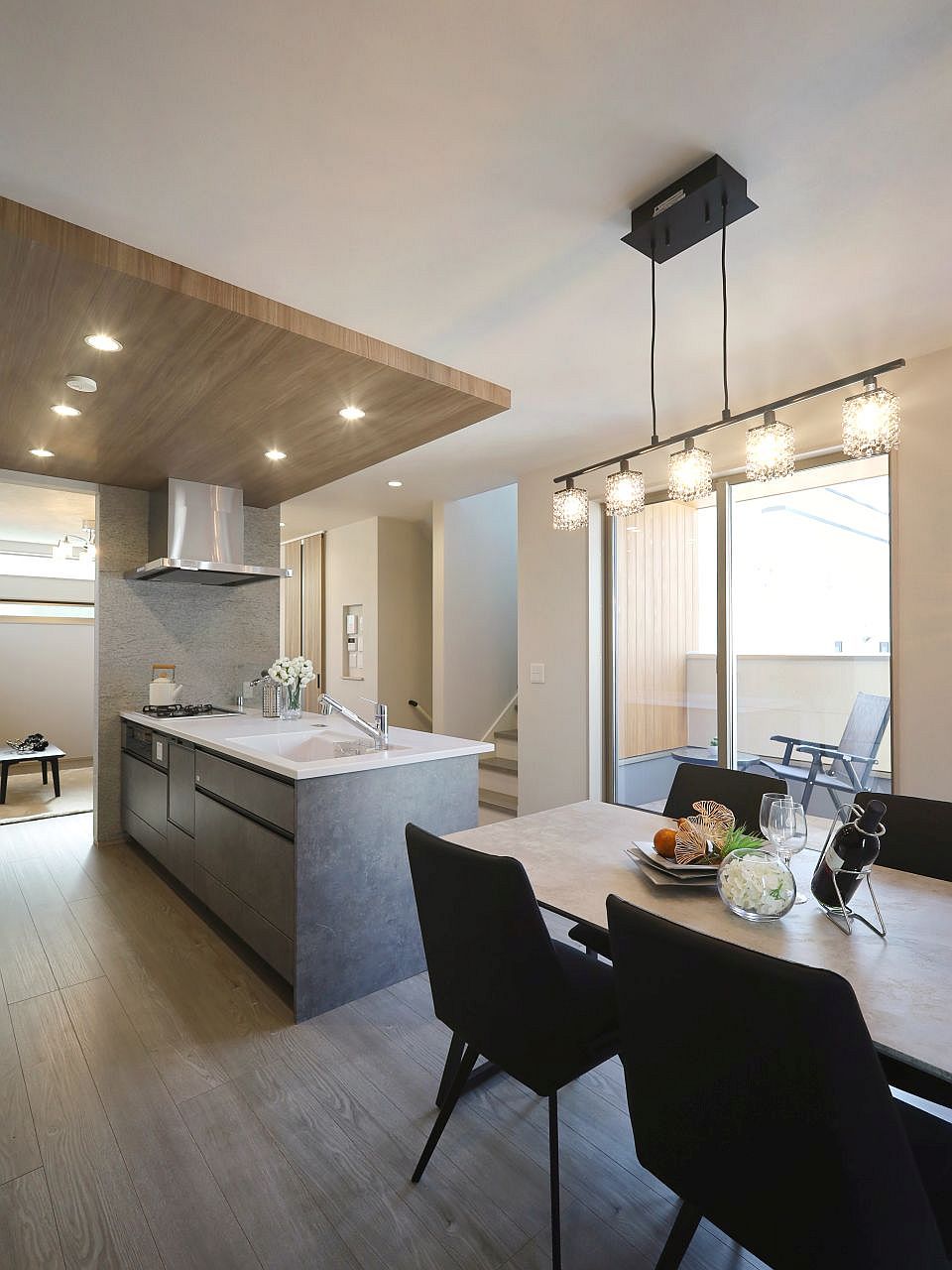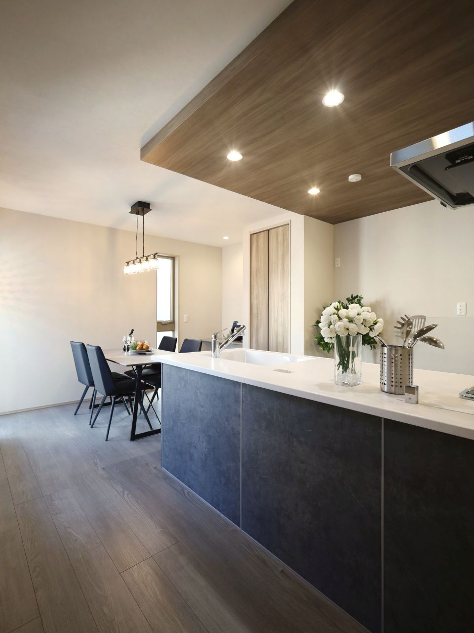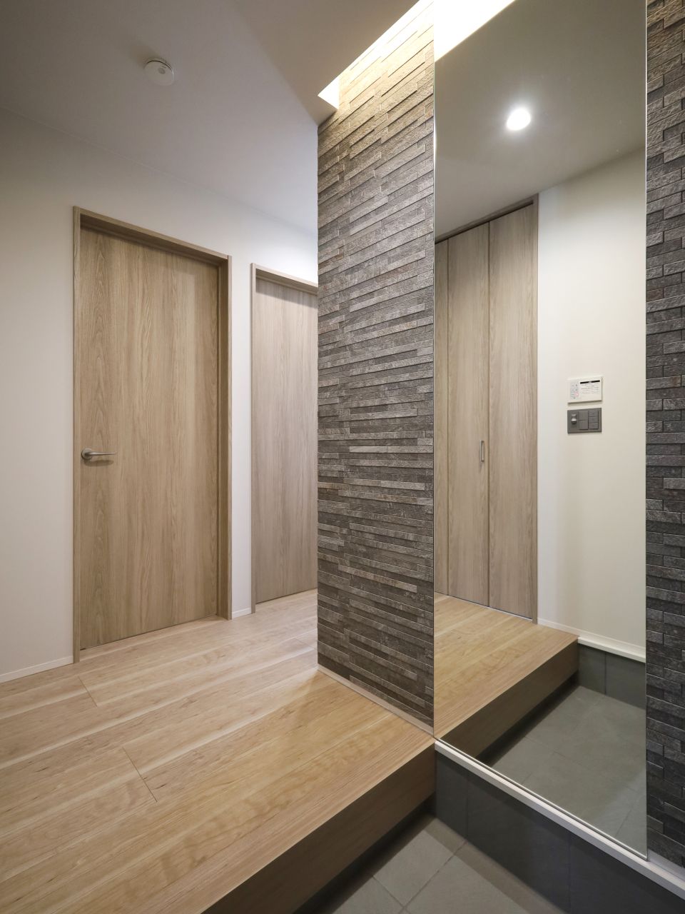 またエクステリア・インテリアともに「真っ白で明るい空間」というよりは落ち着きのある素材や色を選び、光と影のコントラストが美しく出るようなデザインに。間接照明で、エコカラットの凹凸やアクセントクロスが美しく浮かび上がる工夫も施しています。