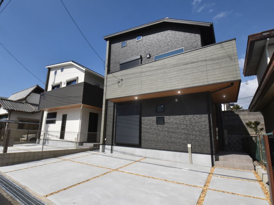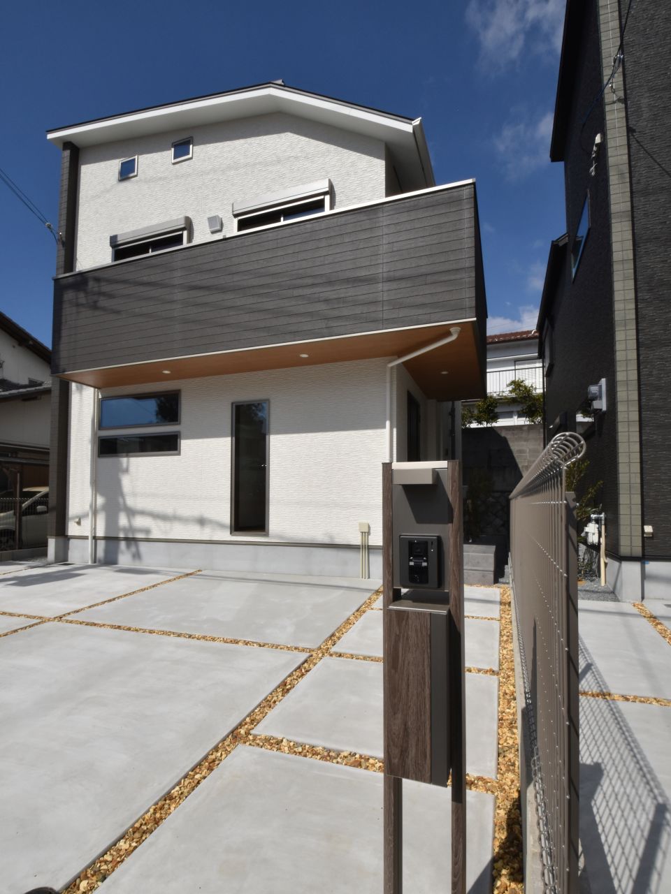 白を基調としたデザインと、黒×グレーのデザインの2区画分譲。凹凸が美しいサイディング外壁が、家全体に質感を与えます。