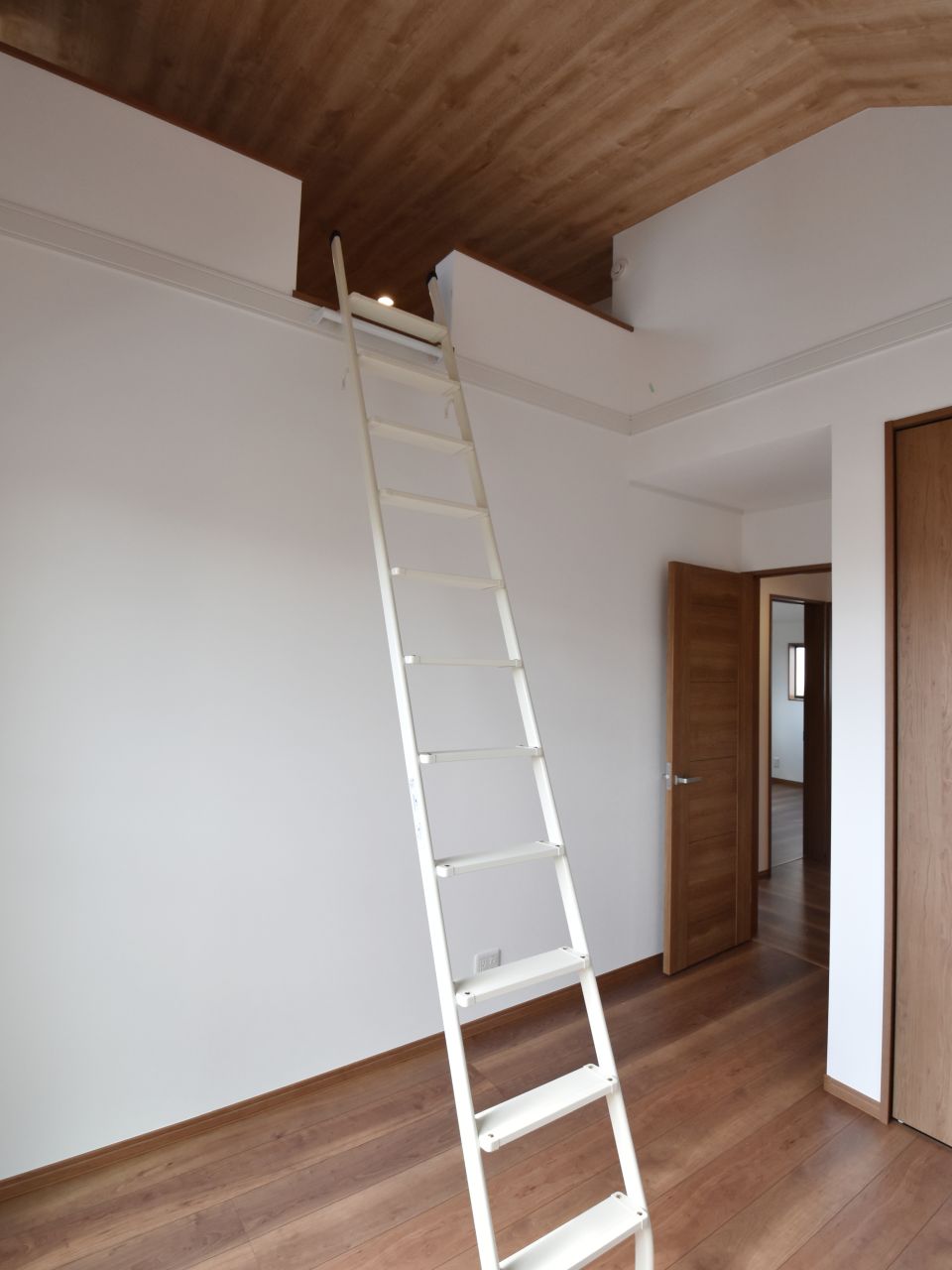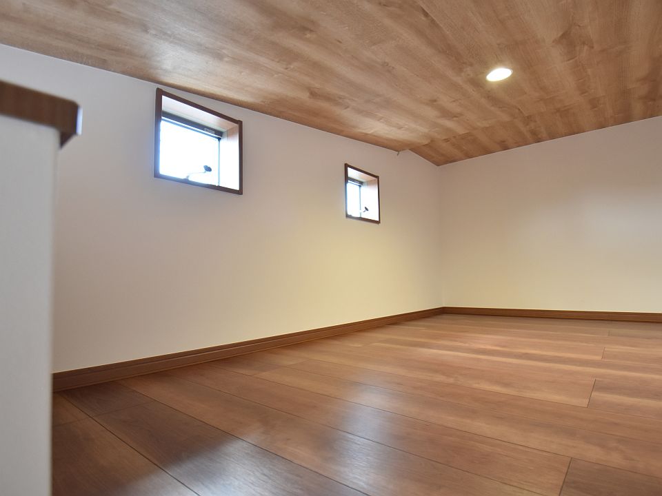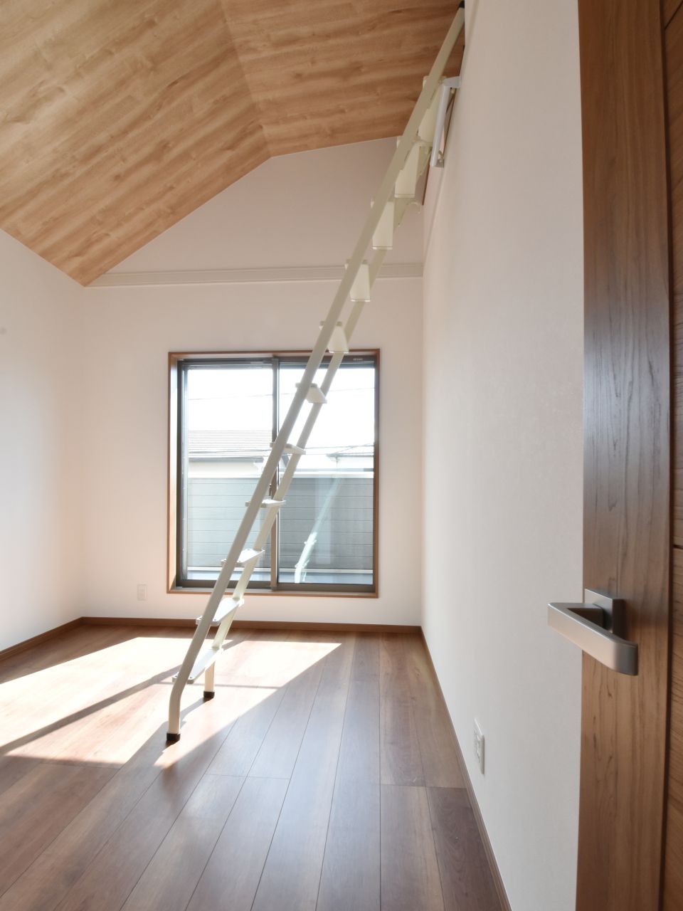 外から見た勾配天井部分は大きなロフトになっています。洋室から上がれるため、お子様の秘密基地にも。