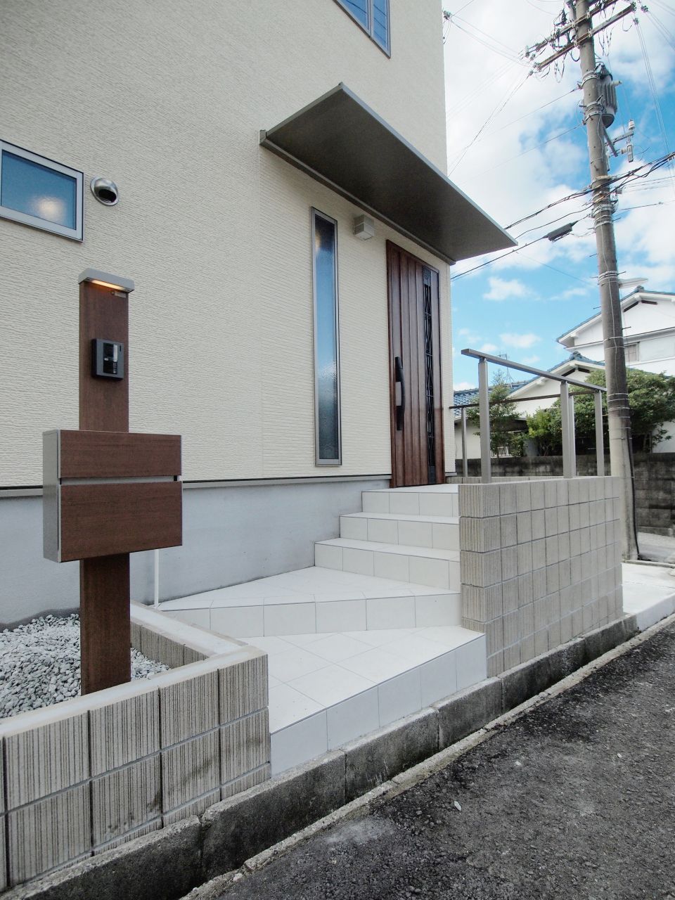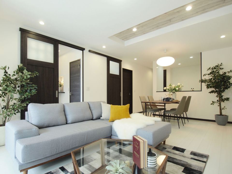神戸市垂水区、海と山に挟まれた高台での分譲実績です。 色味で印象を変えつつ、2邸ともに木目を外観のアクセントにしています。どっしりと構えた地面から、空に伸びていくようなデザインに。 約17帖の1階リビングは、採光のとれる南向きに。折り上げ天井で、広々とした空間を引き締めています。家族のコミュニケーションを自然と増やしてくれるリビング階段も魅力。 穏やかな住宅地の雰囲気を感じながら、休日にはのんびりとまどろむ時間を楽しめる家になりました。