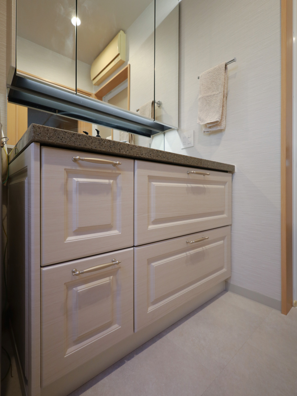 洗面台はオーダーメイドが特長の「ハンセム(HANSSEM)」を採用し、モールディングで外国風の空間に。
