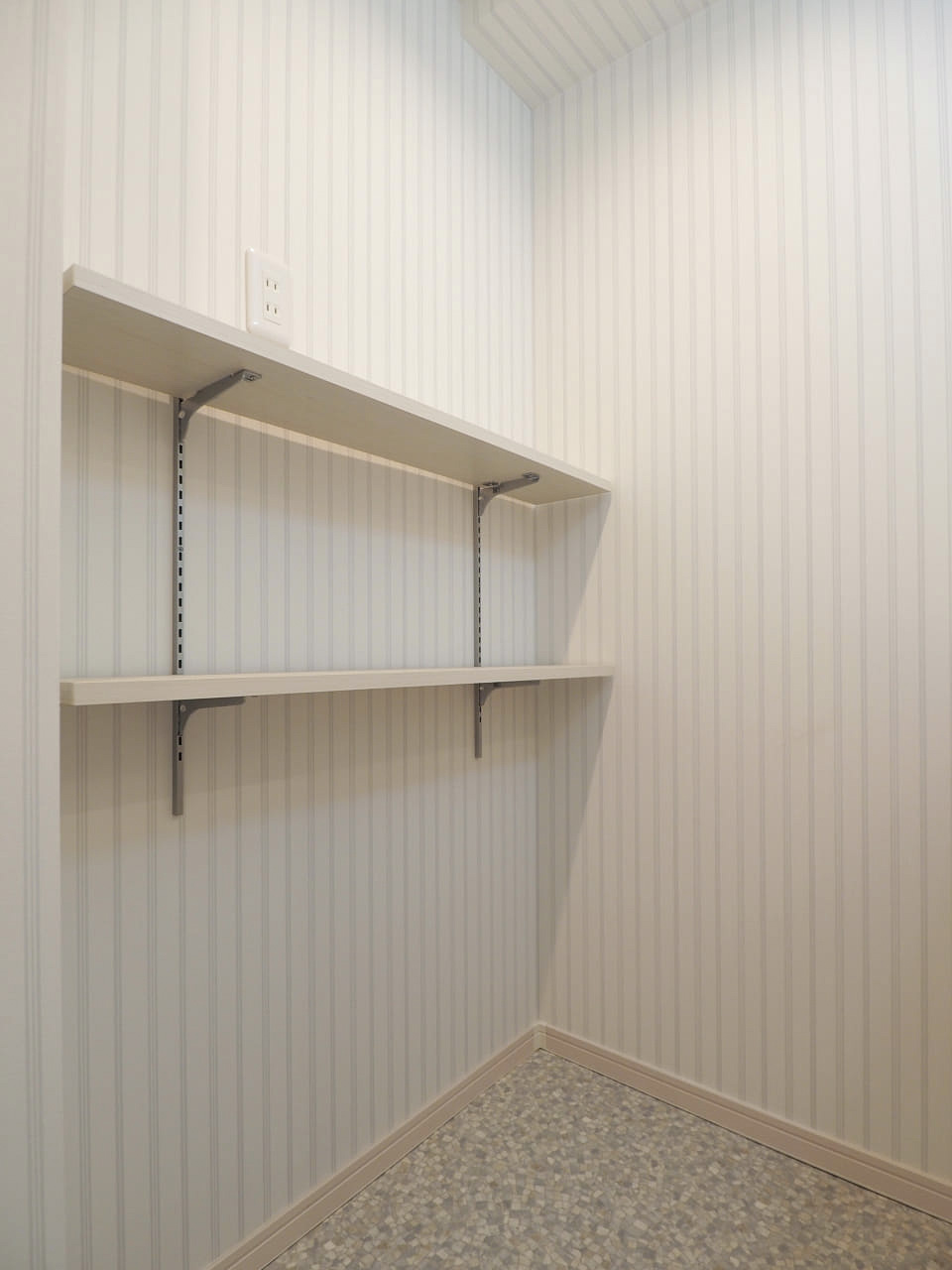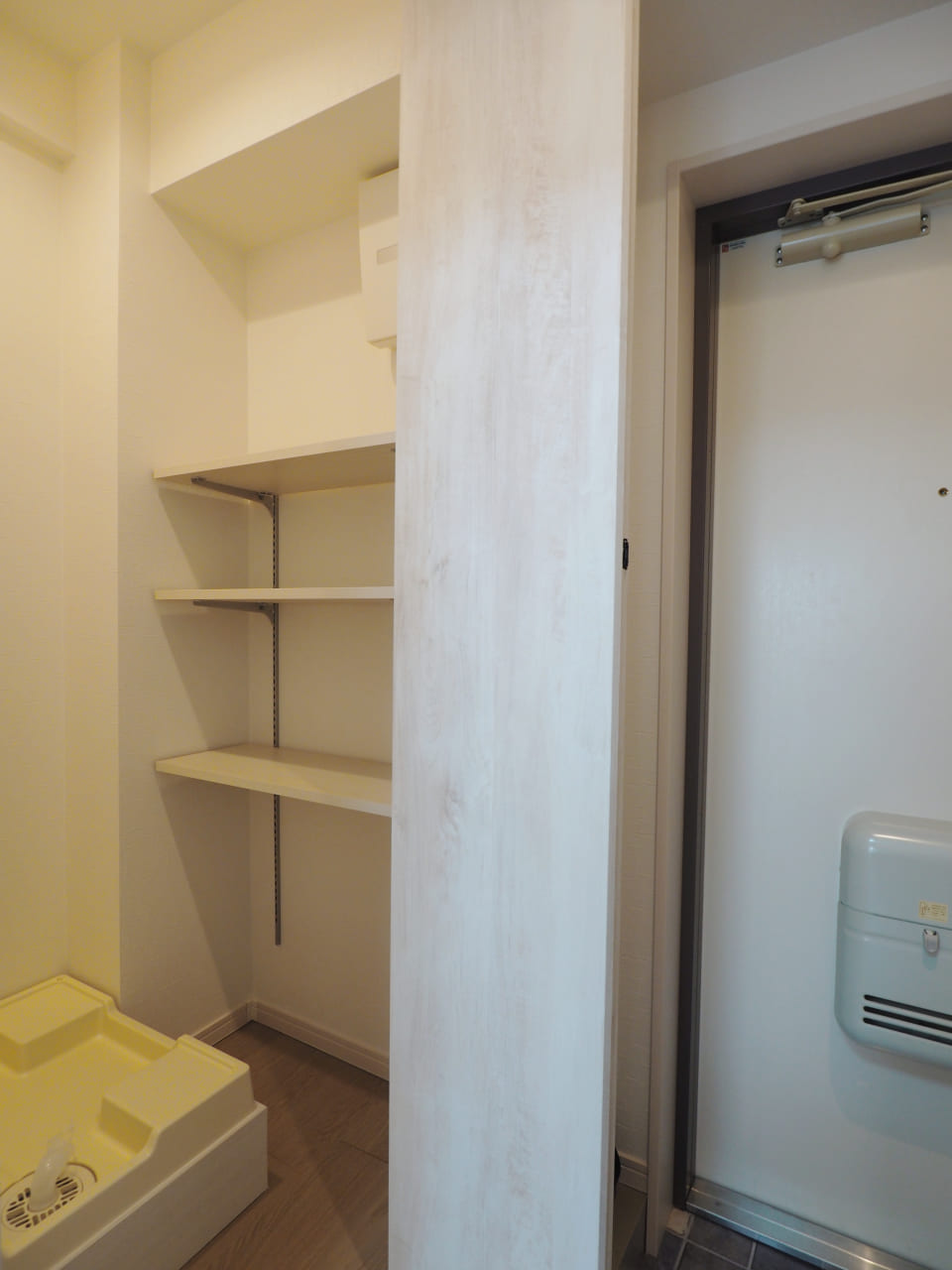入って右手の収納には折れ戸を付け、洗濯パン+可動棚を付けて「隠す」収納に。洗剤や防災グッズなどをたっぷり置けるスペースを設けました。