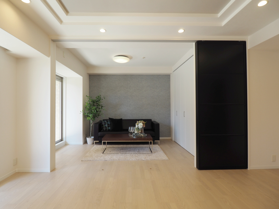 洋室とリビングを仕切るパネルは、めずらしい黒の半透明を採用。スタイリッシュで、かつ抜け感のある建具。それに合わせてシステムキッチンの床も、黒×グレーのフロアタイルをあしらいました。