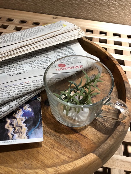 サイドテーブルのコーディネート例なのですが、ガラスのカップに葉っぱ。