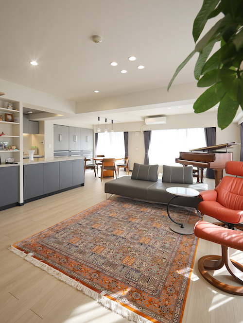 和室を含めた5LDKだったマンションの部屋を、お子様の独立を機に広々とした3LDKに間取り変更。設備もすべて新しくし、ゆったりと暮らせる空間に一新しました。和室にあったピアノも、明るいリビングにお引越し。