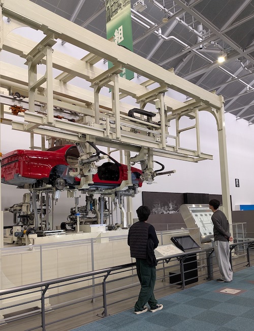 でも「繊維機械館」で手の機織りからハイテク織機までの歴史を見て、「自動車館」でクルマの歴史を学んで、展示もすごい量で2時間でも足りないくらいのボリュームでした。さすが・・・