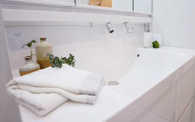 Lavatory洗面台は、LIXIL(リクシル)の「EV」シリーズを採用。間口1650のワイド&フルスライドタイプで、収納たっぷりの三面鏡です。ボウルの横のカウンタースペースは、ちょっとした小物の仮置きに便利。凸凹のない、なめらかで美しいデザインも魅力です。